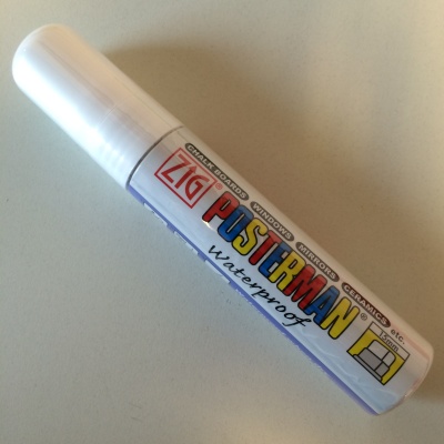 ZIG Posterman PMA-120 stift breed, beitelpunt met schrijfbreedte 7-15 mm, wit, niet met water uitwisbaar. PMA-120/000 white Enkel te gebruiken op een niet poreuse ondergrond. Te verwijderen met een reiniger. (Lukt niet met een sopje) Product Features Water resistant after drying / Suitable for various surfaces / Erasable from non porous surfaces using ZIG POSTERMAN CLEANER (Item No.PMACL-50) TIP SIZE: 15 mm Contents INK TYPE: Hi-Opaque, Lightfast, Odourless, Xylene Free Ink Type waterbased pigment