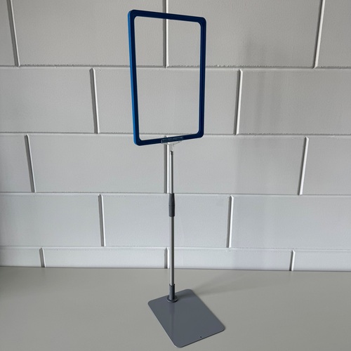 Standaard A4 blauw raam met transparant T-stuk, verstelbare aluminium buis en metalen grijze voetplaat. Verstelbaar/ uitschuifbaar van 32 tot 58 cm.