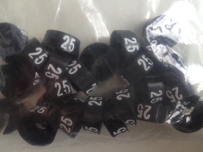 MB wisersizer zwart/wit 25 voor op kledinghanger, zakje met 25 stuks. Diameter 19,2mm hoogte 8,3mm - cijferhoogte 6,2mm. Geschikt voor hangers met diameter van 2 tot 3,5mm.