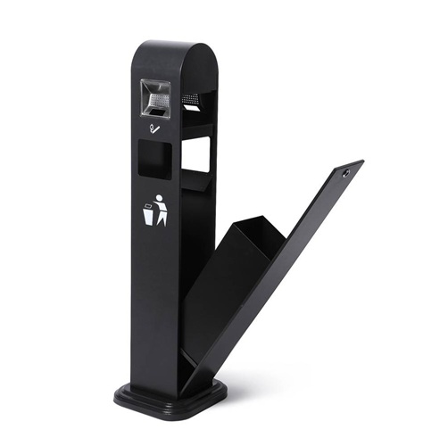 Asbak zwart metaal vrijstaand, voor sigarettenpeuken en afval voor buiten bij de ingang van uw bedrijf. Hoogte 120 cm, voetafmeting 31,5 x 31,5 cm. Gewicht 11,6 kg. Geschikt voor buiten gebruik. Uitermate geschikt om bij de ingang van uw bedrijf, restaurant, hotel, winkel, kantoor, expo, musea etc. te plaatsen. Makkelijk te verplaatsen en legen. Inhoud van de staande asbak is: 11 liter. Er zijn geen bevestigingsmaterialen bij om de paal te verankeren. Hij staat normaal gesproken los en is makkelijk weg te zetten (wel om paal & voet te bevestigen)