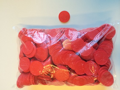 Betaalmunten / consumptiemunten rood met ster in reliëf. Verpakking met 500 stuks. Diameter betaalmunt is 29mm.