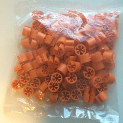 Minimarker onbedrukt oranje, verpakt in zakjes met 100 stuks. Diameter 13mm, hoogte 10mm. Geschikt voor kledinghangers met diameter van 2,5 tot 3,5mm.