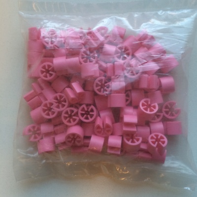 Minimarker onbedrukt roze, verpakt in zakjes met 100 stuks. Diameter 13mm, hoogte 10mm. Geschikt voor kledinghangers met diameter van 2,5 tot 3,5mm.