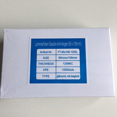 Lamineerhoes / lamineersheets glanzend 65x108 mm dikte 2 x 125 micron, verpakking met 100 stuks.