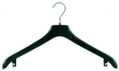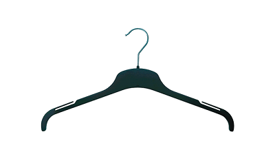 Hanger zwart NA43 uitvoering met antislip op de schouders, japon, blouse, breigoed. Platte standaard hanger voor blouses. breedte 43cm, dikte 8mm, doosinhoud 100 stuks. Materiaal Polystyrol voor 98% uit gerececled polystyrol. Haken: verzinkt chromatiert 3,0 x 98 mm. Geschikt voor kledingmaten L en XL. Kledinghanger, kleerhanger, kapstok.