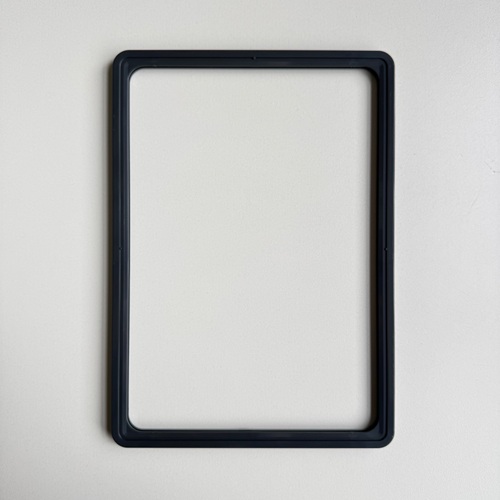 Prijskaartraam A4 zwart - RAL 9005, profiel-1. Geschikt voor papiermaat Din A4 = 21x29,7cm. De bovenste korte zijde heeft een vulopening. Kan ook horizontaal gebruikt worden.